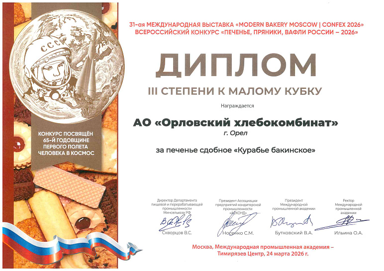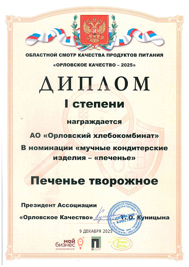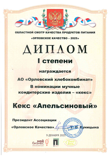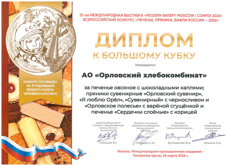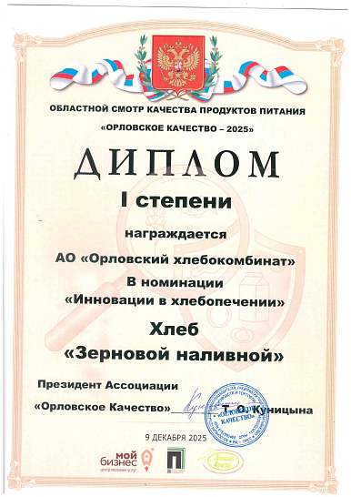 Но, пожалуй, самый ценный для предприятия — диплом лауреата Всероссийского конкурса «Лучшие российские предприятия», где Орловский хлебокомбинат награждён среди множества предприятий пищевой промышленности за наиболее эффективное использование всех видов производственных ресурсов.